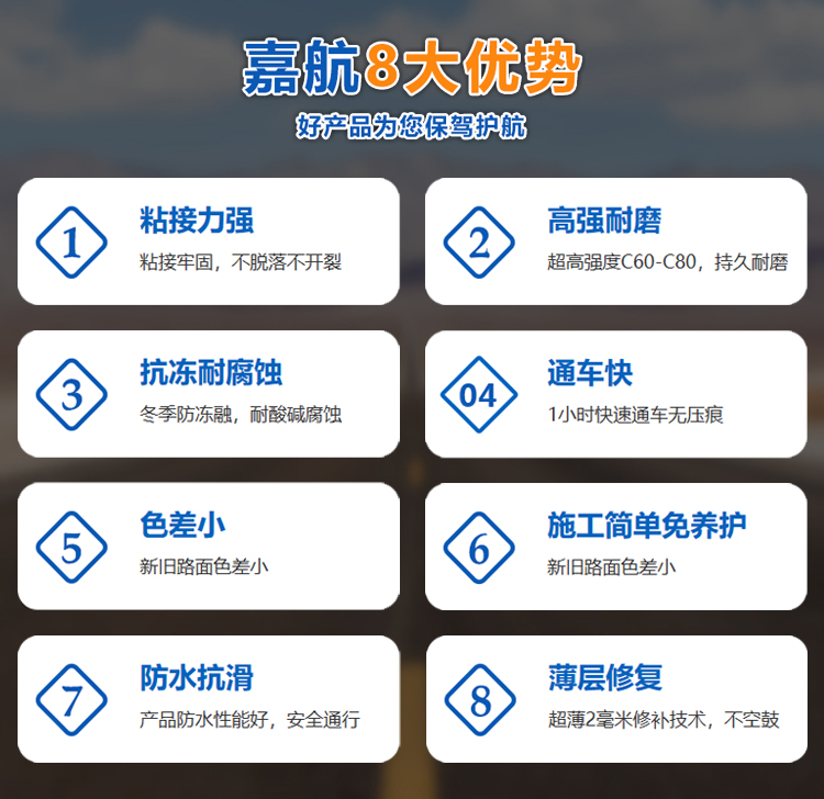 河南嘉航新材料科技有限公司,是一家集研发、销售为一体的水泥路面修补材料大型供应企业公司自成立以来,致力于打造全国路系统路桥养护材料实力品牌,专注于水泥路面修补材料的技术研发与产品修补应用。在村村通道路验收与修复、市政道路养护,以及国省道、高速公路、高速服务区、加油站、广矿物流园、小区学校等领 域的路面养护与病害修复 ,积累了主富的修复经验公司坚持秉承产品质量为企业生命线的经营理念......